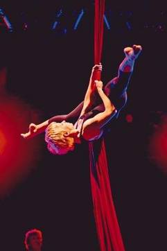 Ein Multitalent ist Andrea Engler. Die Varieté-Künstlerin wirbelt Hula-Hoop- Reifen durch die Luft und in einer anderen Nummer zeigt sie atemberaubende Luftakrobatik. Die Reifen tauschte sie gegen zwei lange Vorhangtücher ein. Daran verknotet beeindruckte sie in schwindelnd erregender Höhe durch eine halsbrecherische Choreografie, die eines Hochleistungssportlers würdig ist, durch Dramatik nicht zu überbieten und trotzdem graziös und anmutig ist. Kurz: Virtuoses Ballett unter der Zirkuskuppel.
